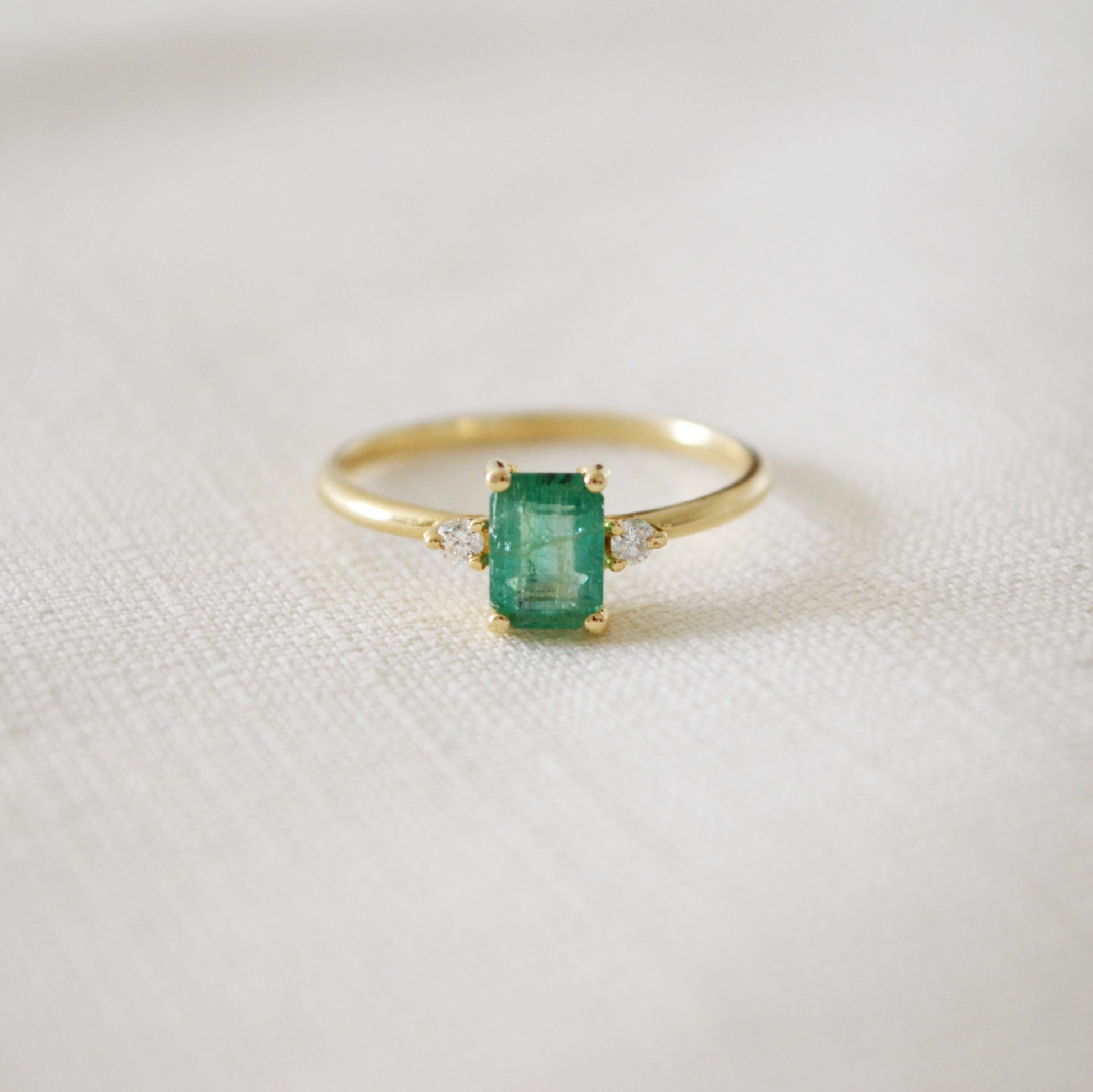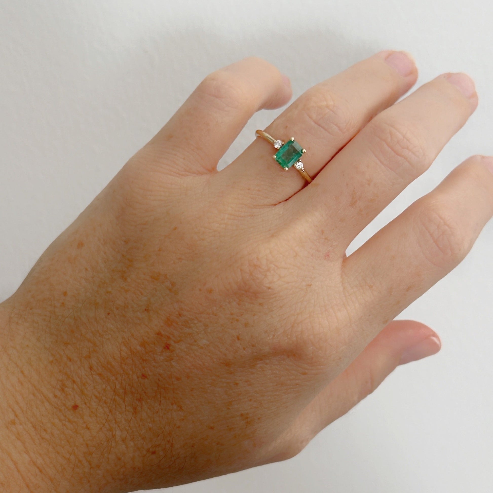 Anillo con una Esmeralda central de 0.75 ct y dos diamantes laterales en oro amarillo de 14k.