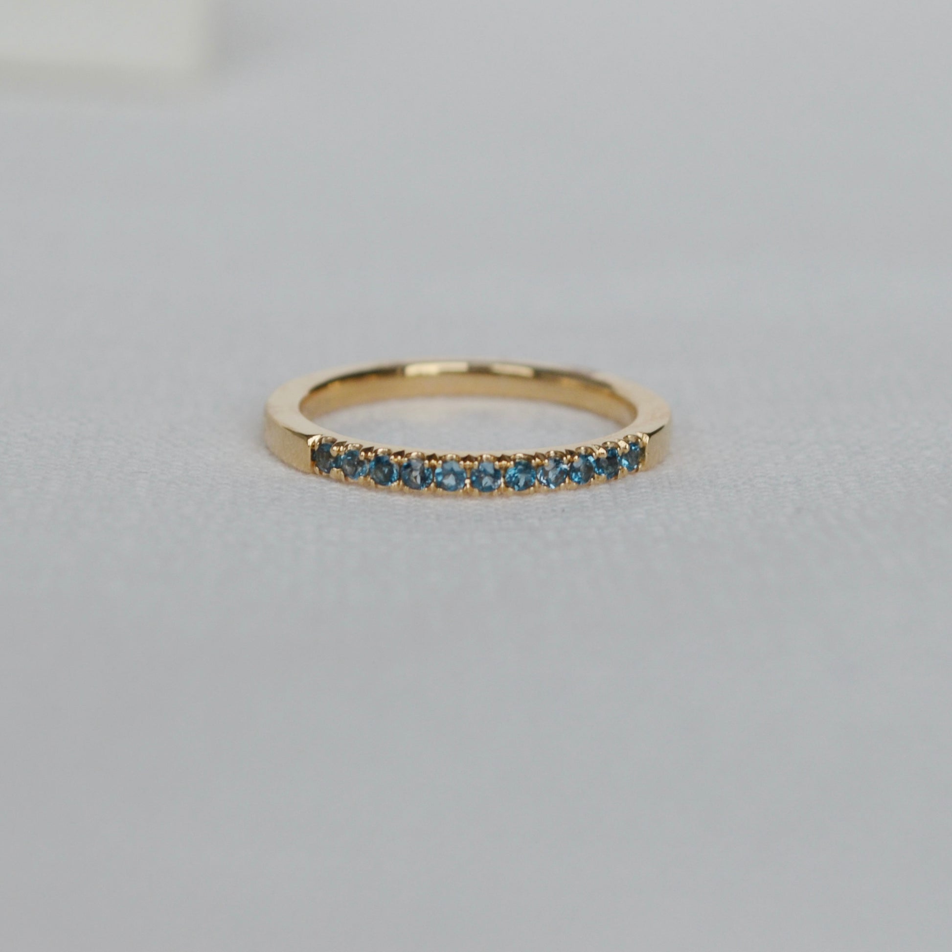 Celebra diciembre con el brillo sereno del topacio azul, piedra que representa calma, claridad y buena fortuna. Engastada en oro amarillo de 14 quilates, esta churumbela es perfecta para regalar o atesorar.